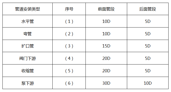 安裝儀表時(shí)應(yīng)遠(yuǎn)離彎頭,障礙物,變徑,閥門,以保證有一個(gè)穩(wěn)定的流場,一般要求有一個(gè)較長的上下直管道,前直管段長大于10D,后直管段長大于5D。
