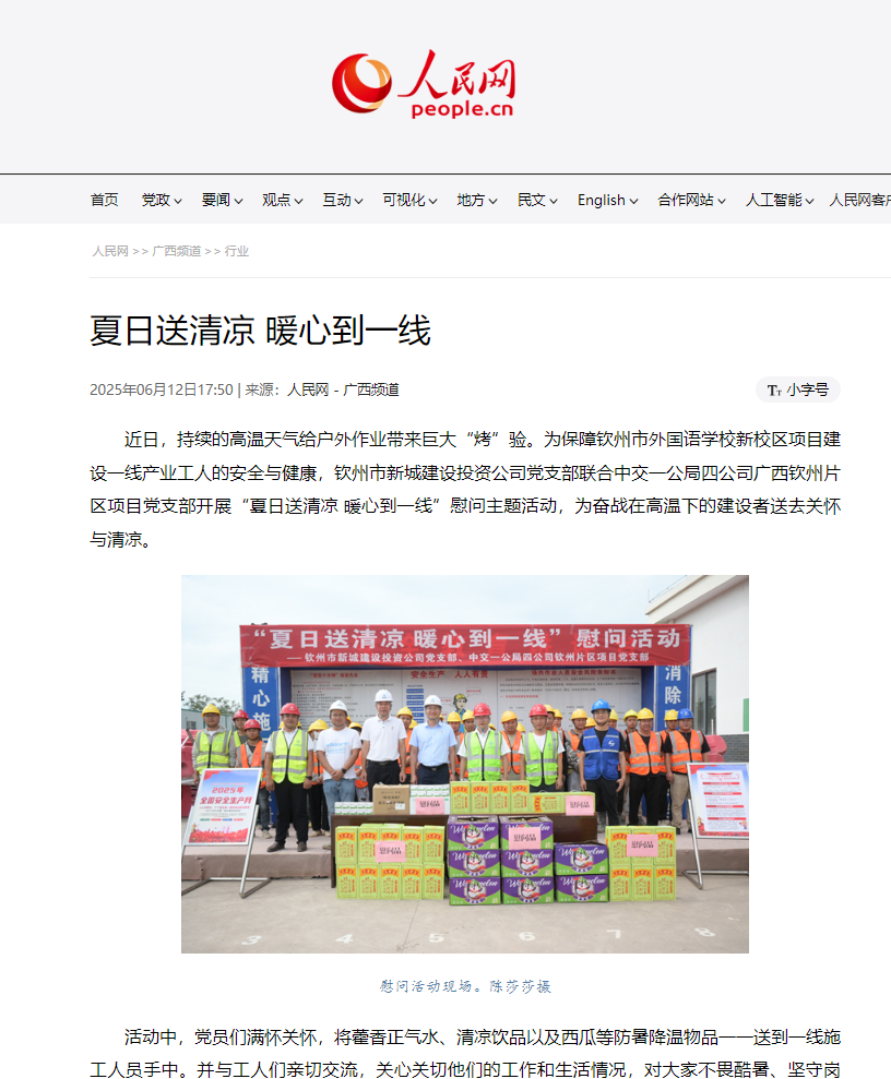6月12日,人民網(wǎng)-廣西頻道以《夏日送清涼 暖心到一線》為題報(bào)道市濱投集團(tuán)公司黨委下屬建投公司黨支部......