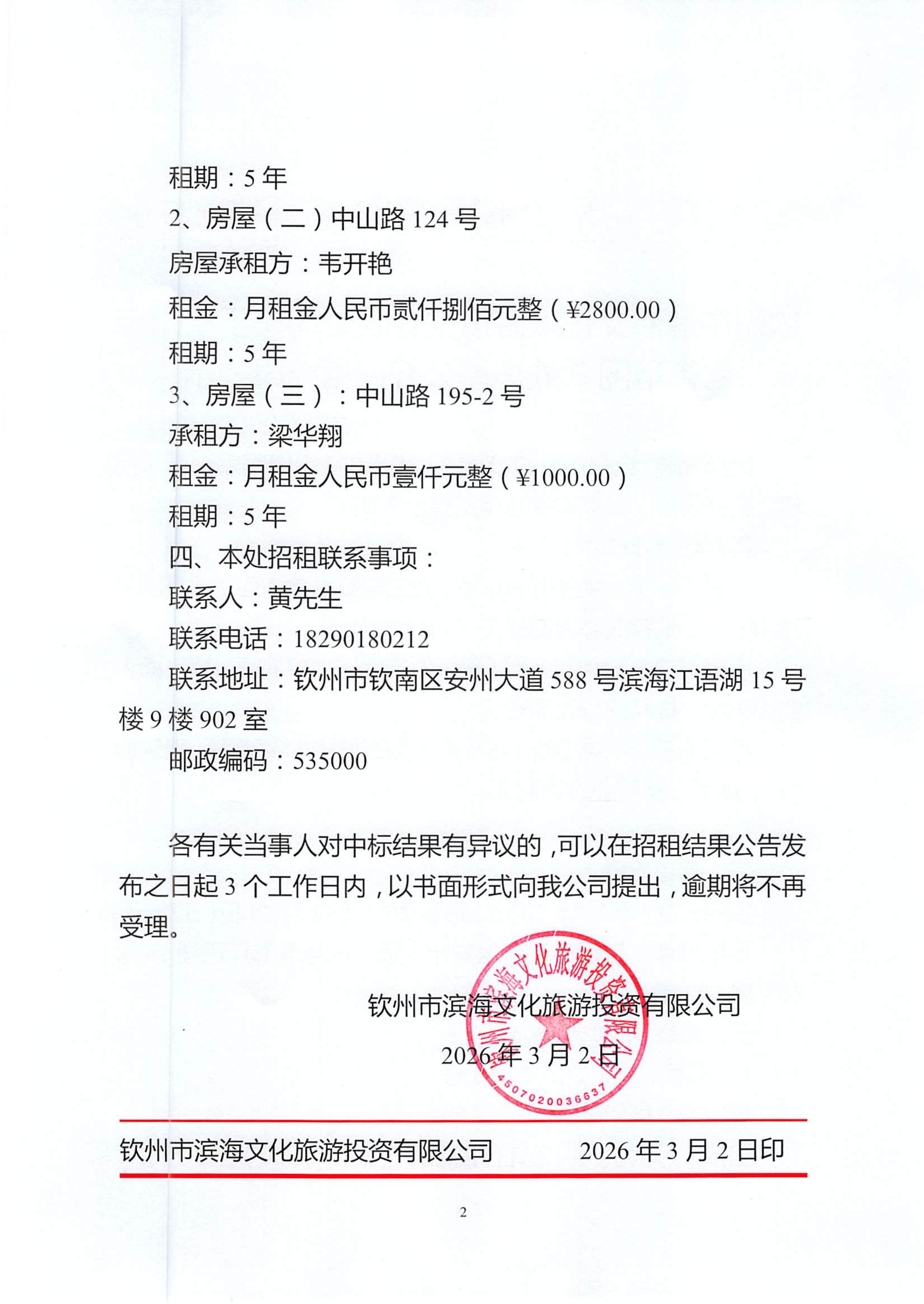 欽州市濱海文化旅游投資有限公司關(guān)于欽州市老街范圍3處房屋公開招租結(jié)果公示