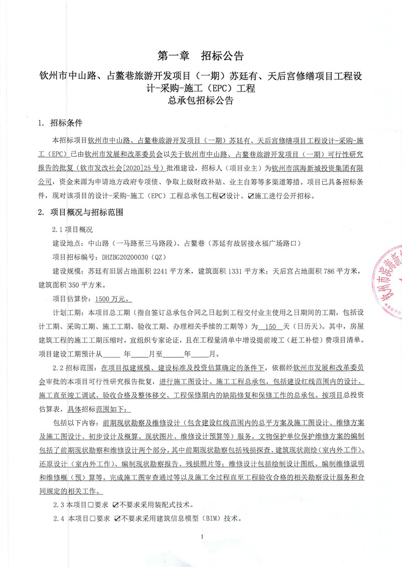 欽州市中山路、占鰲巷旅游開發(fā)項目(一期)蘇廷有、天后宮修繕項目工程設(shè)計-采購-施工(EPC)工程總承包招標公告