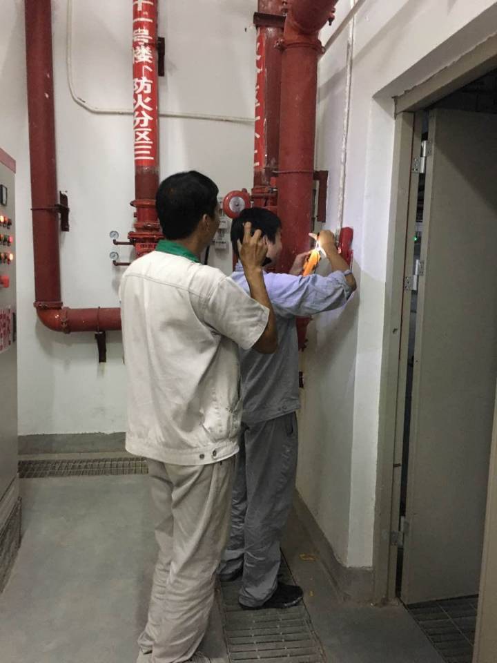 圖為消防維保單位及物業(yè)工程人員在進(jìn)行現(xiàn)場(chǎng)消防設(shè)施檢查
