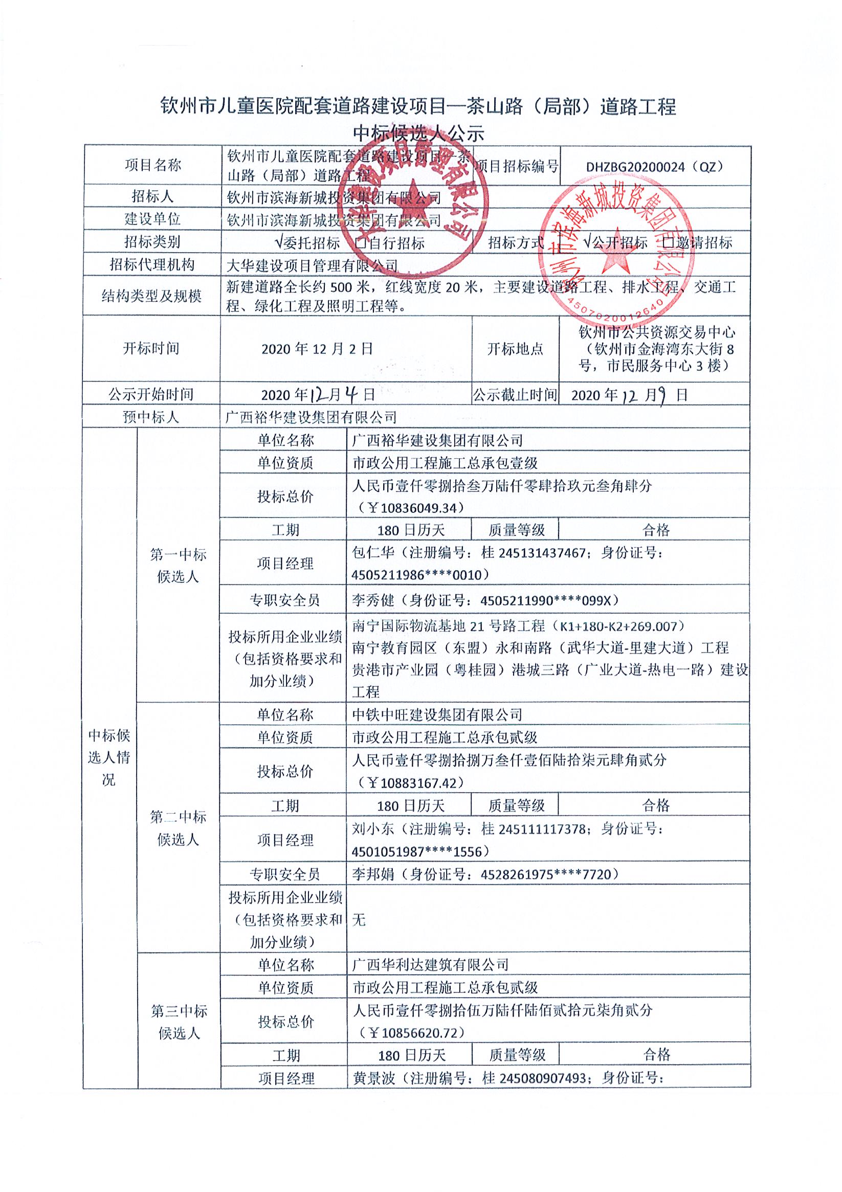 欽州市兒童醫(yī)院配套道路建設(shè)項(xiàng)目—茶山路(局部)道路工程中標(biāo)候選人公示