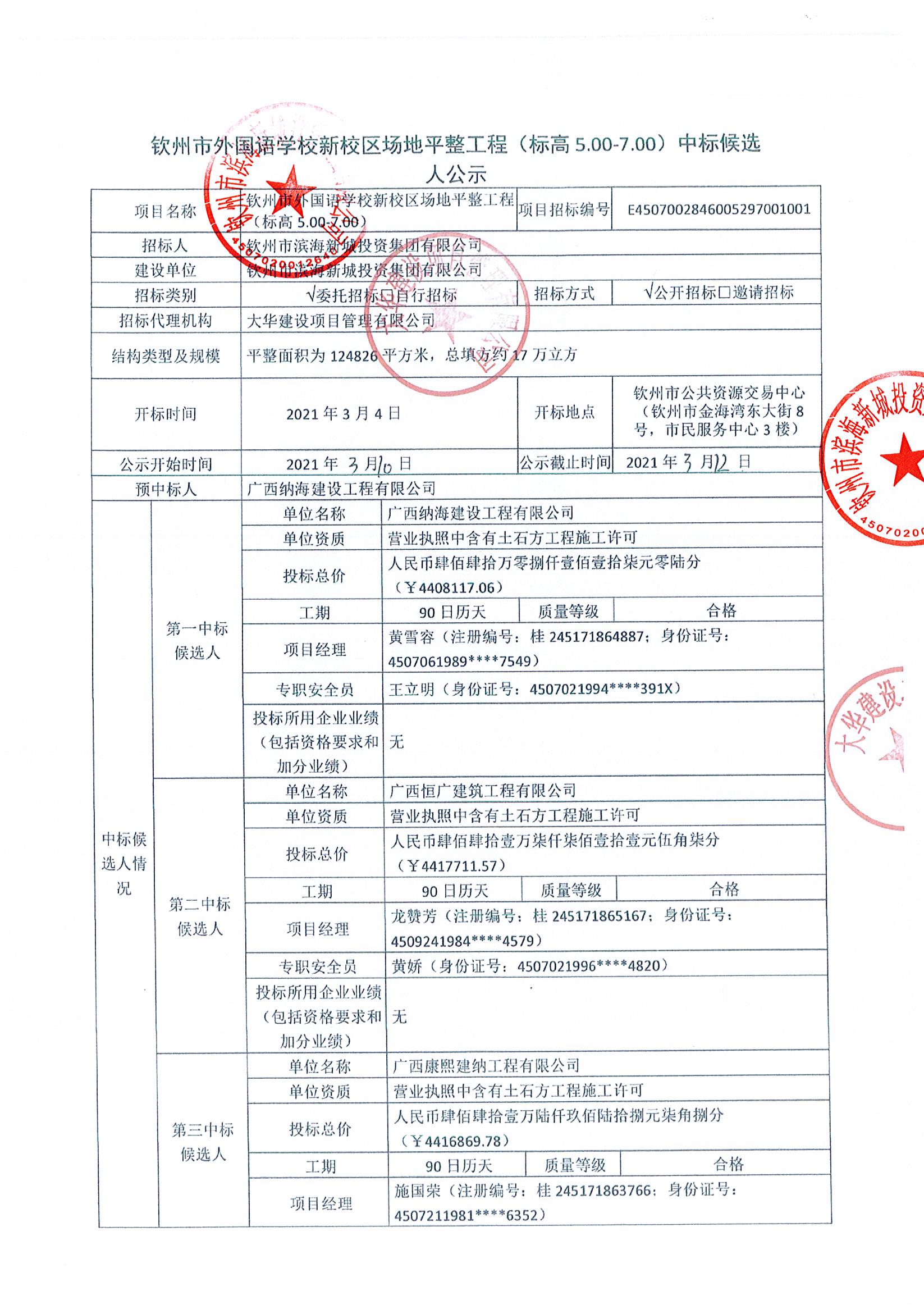 欽州市外國語學(xué)校新校區(qū)場地平整工程(標(biāo)高5.00-7.00)中標(biāo)候選人公示