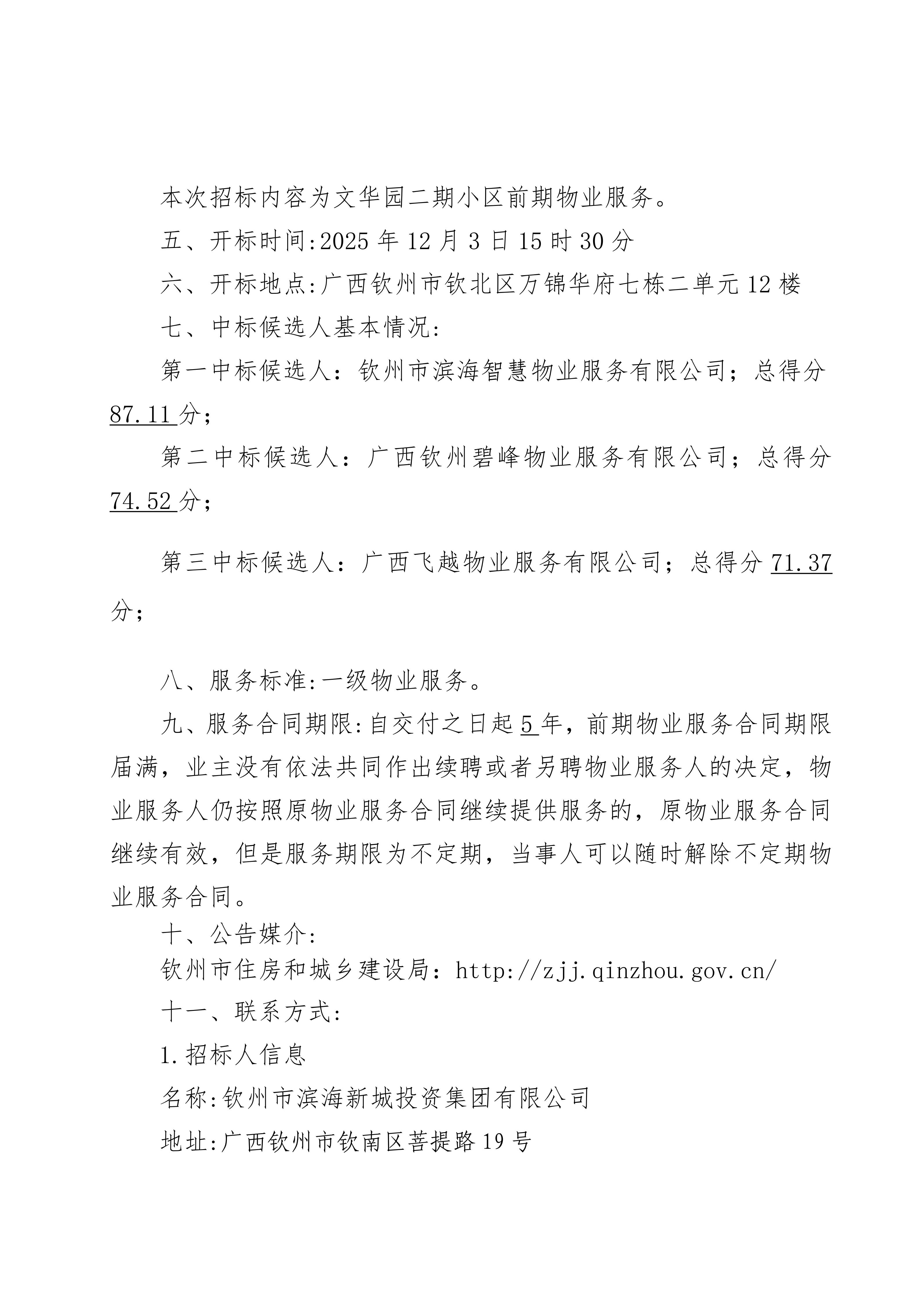 文華園二期小區(qū)前期物業(yè)管理招投標中標候選人公示信息