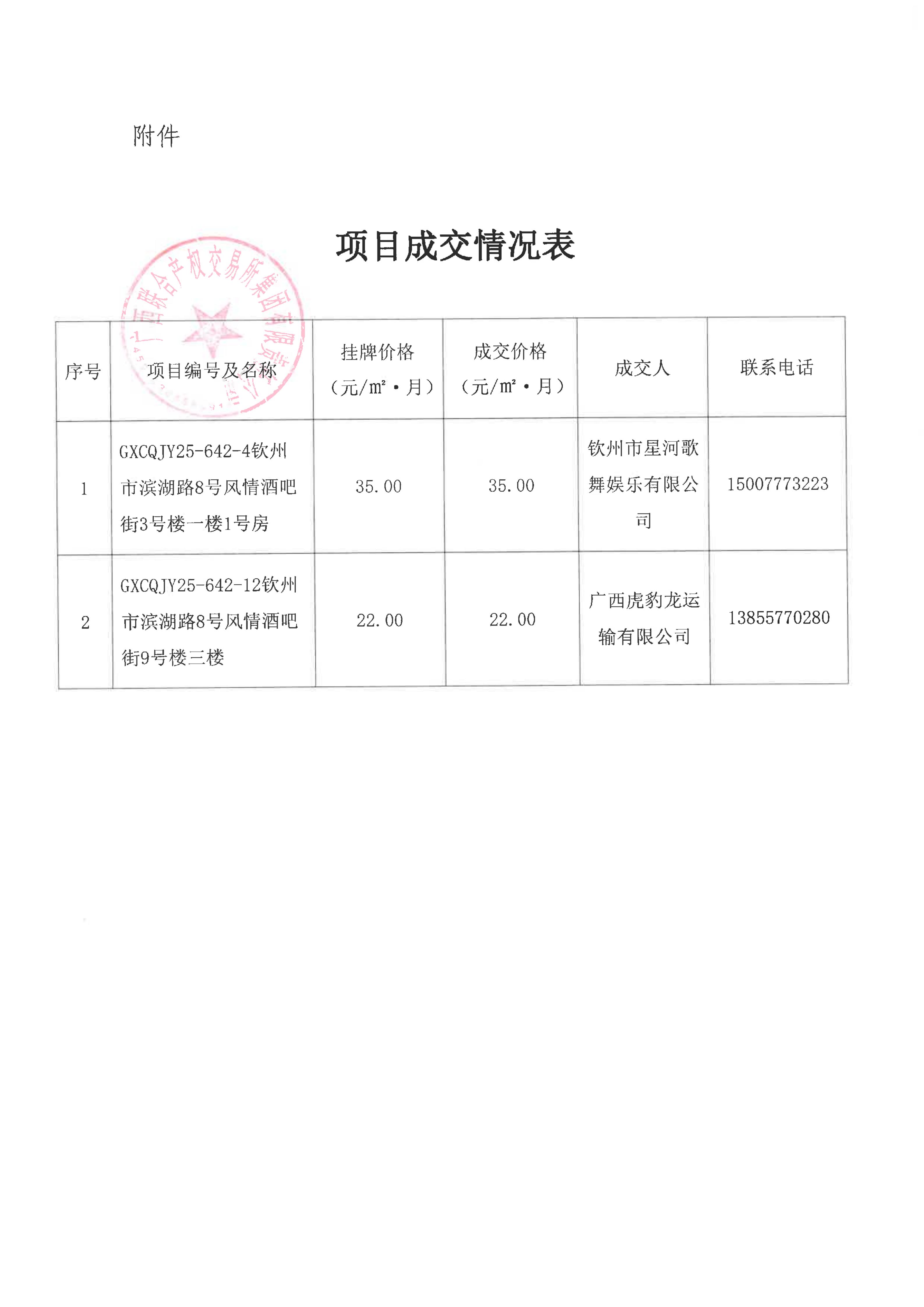關于欽州市濱湖路8號風情酒吧街(蘭亭街)房屋公開招租項目成交情況的函(1#-1)
