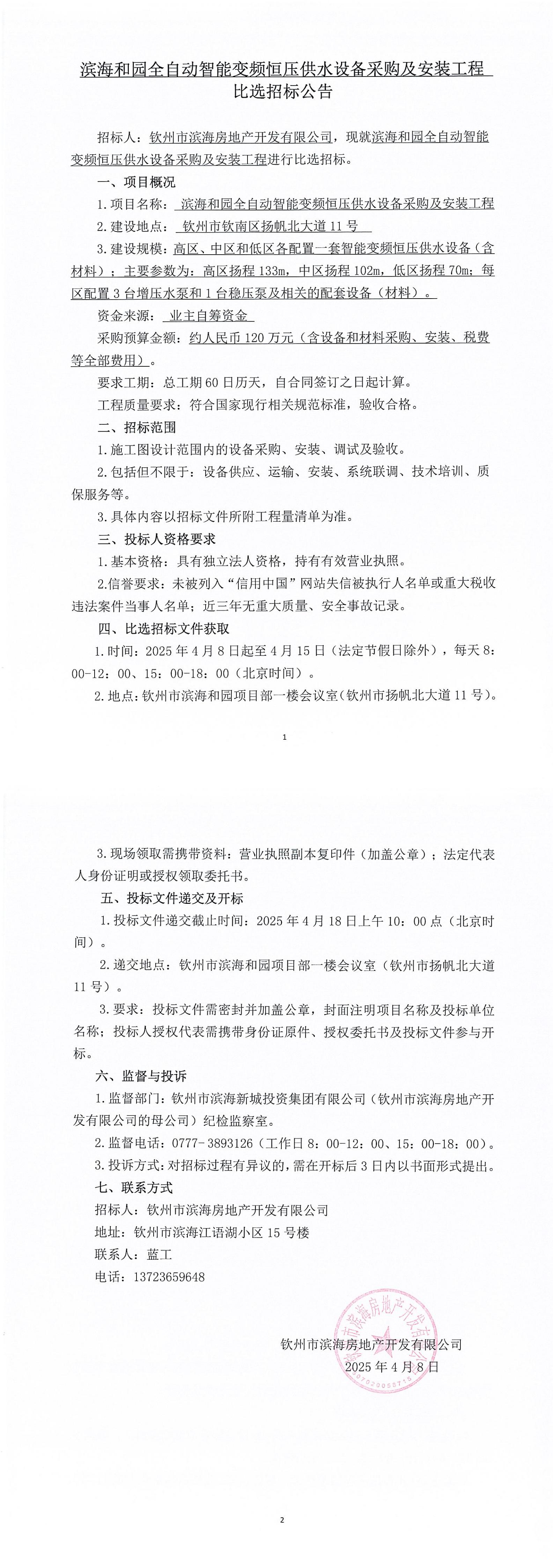 濱海和園全自動智能變頻恒壓供水設備采購及安裝工程比選招標公告
